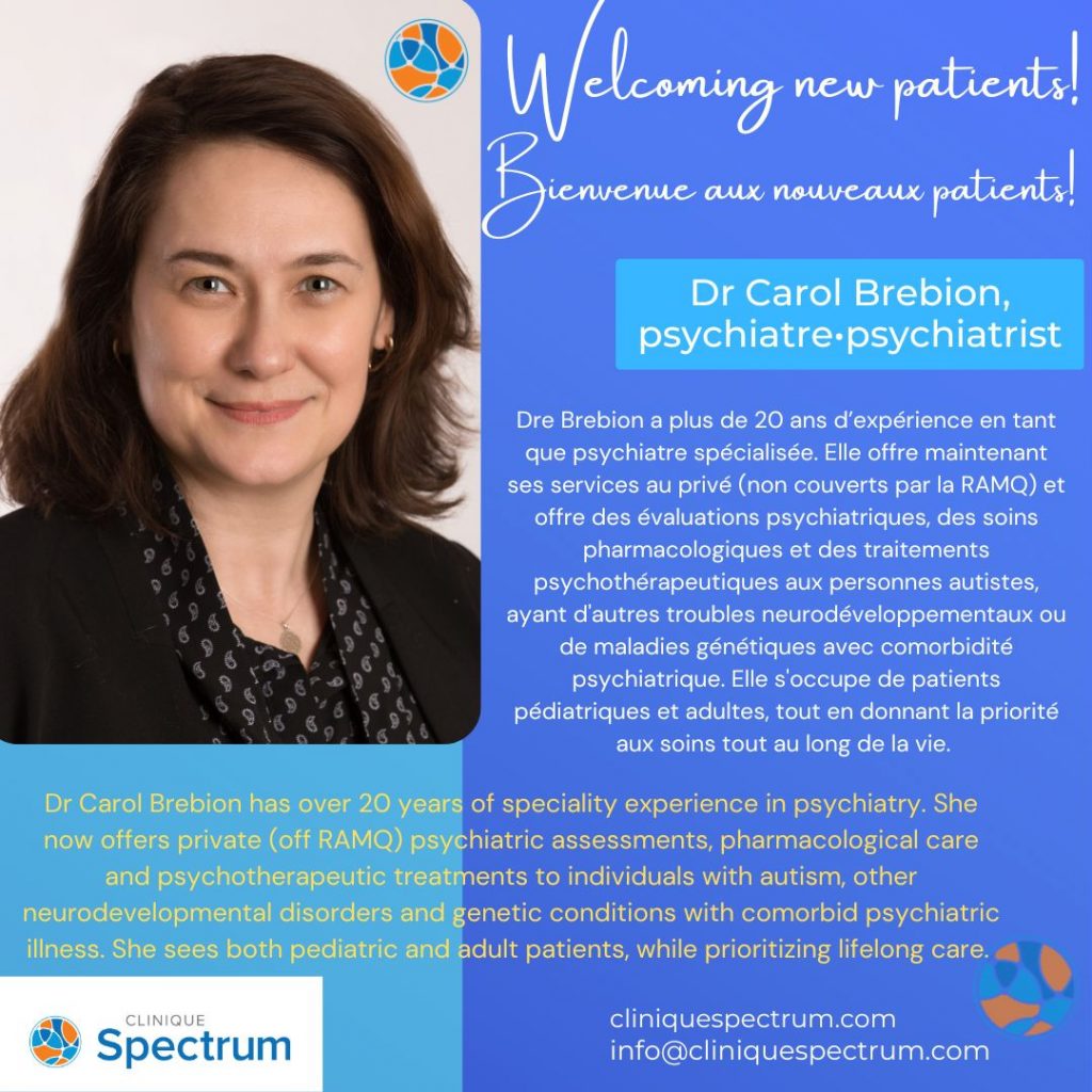 Dr Carol Brebion is a founding member of Clinique Spectrum. She has over 20 years of speciality experience in psychiatry. She now offers private (off RAMQ) psychiatric assessments, pharmacological care and psychotherapeutic treatments to individuals with autism, other neurodevelopmental disorders and genetic conditions with comorbid psychiatric illness. Health services receipts are be provided for income tax purposes. Dr Brebion provides community based psychiatric assessment, consultation and treatment for children, adolescents and adults with neurodevelopmental disabilities and mental health needs (dual diagnosis). Psychopharmacological treatment is also offered. Our goal is to support mental health and recovery, improve quality of life, and prevent unnecessary hospital stays.