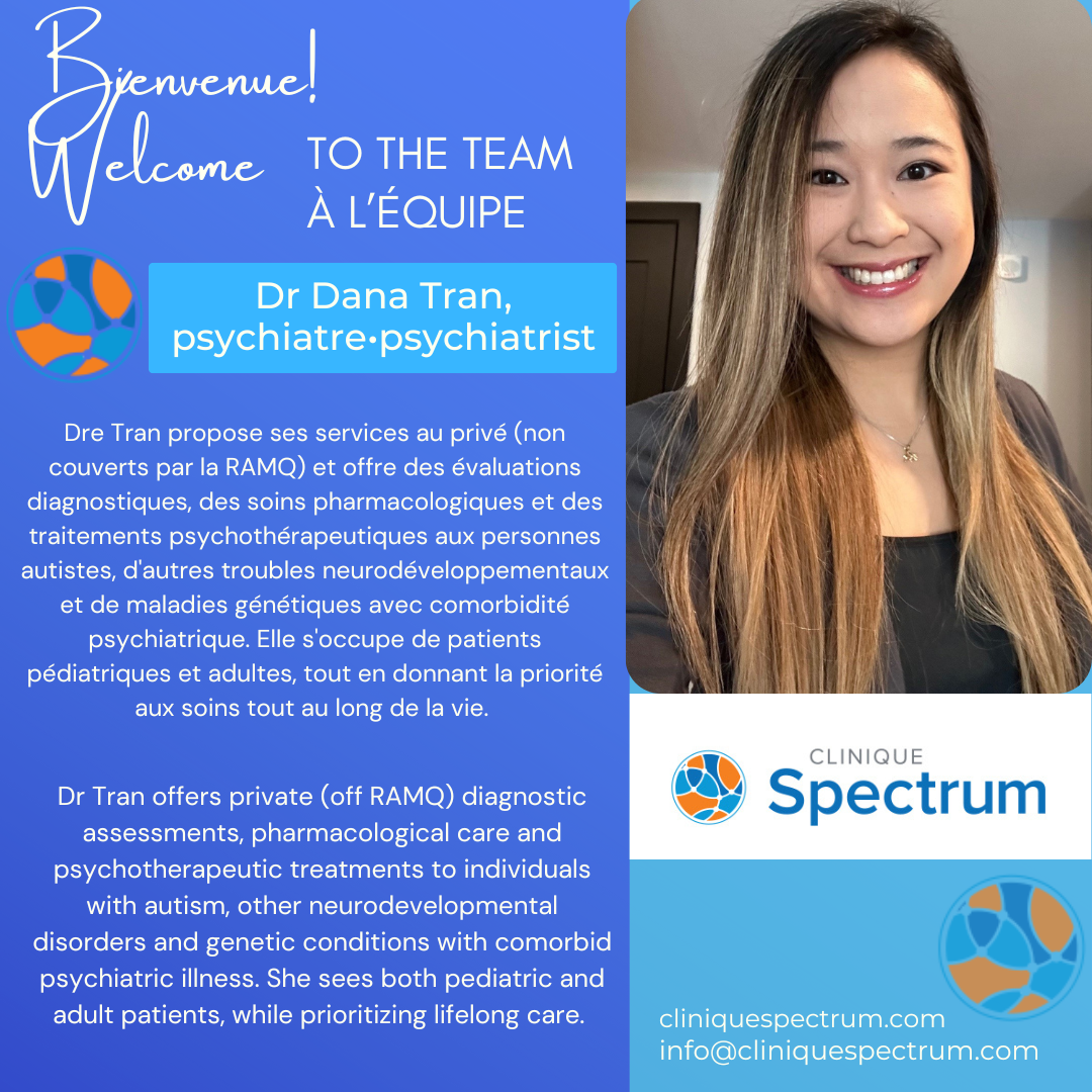 We’re very excited to welcome Dr Dana Tran, psychiatrist, to our team. Dr Tran has completed two specialist residencies in neurodiversity, and we’re excited to share her breadth of knowledge with our community. She offers her services to children, adolescents and adults on the autism spectrum, as well as those with other neurodevelopmental issues including ADHD, Tourette’s, Non-verbal learning disability, specific genetic conditions and intellectual disability. She offers her services privately (off RAMQ) and health services receipts will be provided for income tax purposes.