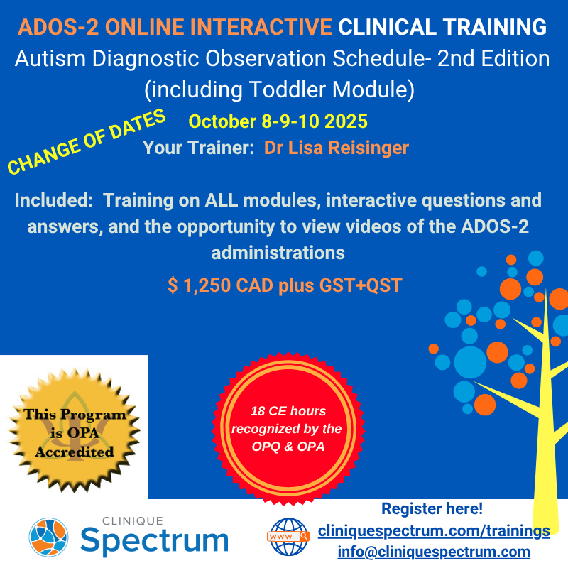 Included: Training on ALL modules, interactive questions and answers, and the opportunity to view videos of the ADOS-2 administration